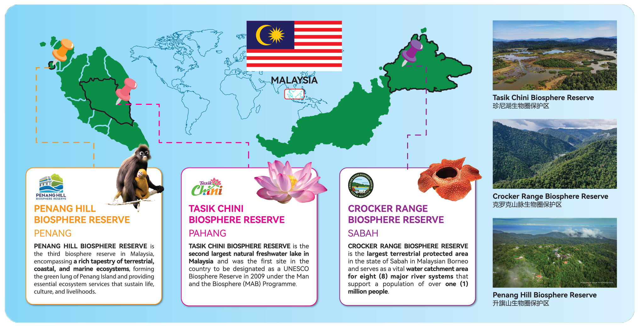 全球保育格局正面临前所未有的挑战,生物多样性正以惊人的速度加速流失。马来西亚同样无法幸免于这些压力,并持续应对着自身复杂的环境问题。为此,我国坚定地致力于通过国内外的多方努力,来解决保育及可持续发展等课题。马来西亚拥有三个隶属于联合国教科文组织“人与生物圈计划”的生物圈保护区,彰显其全球性的生态地位: